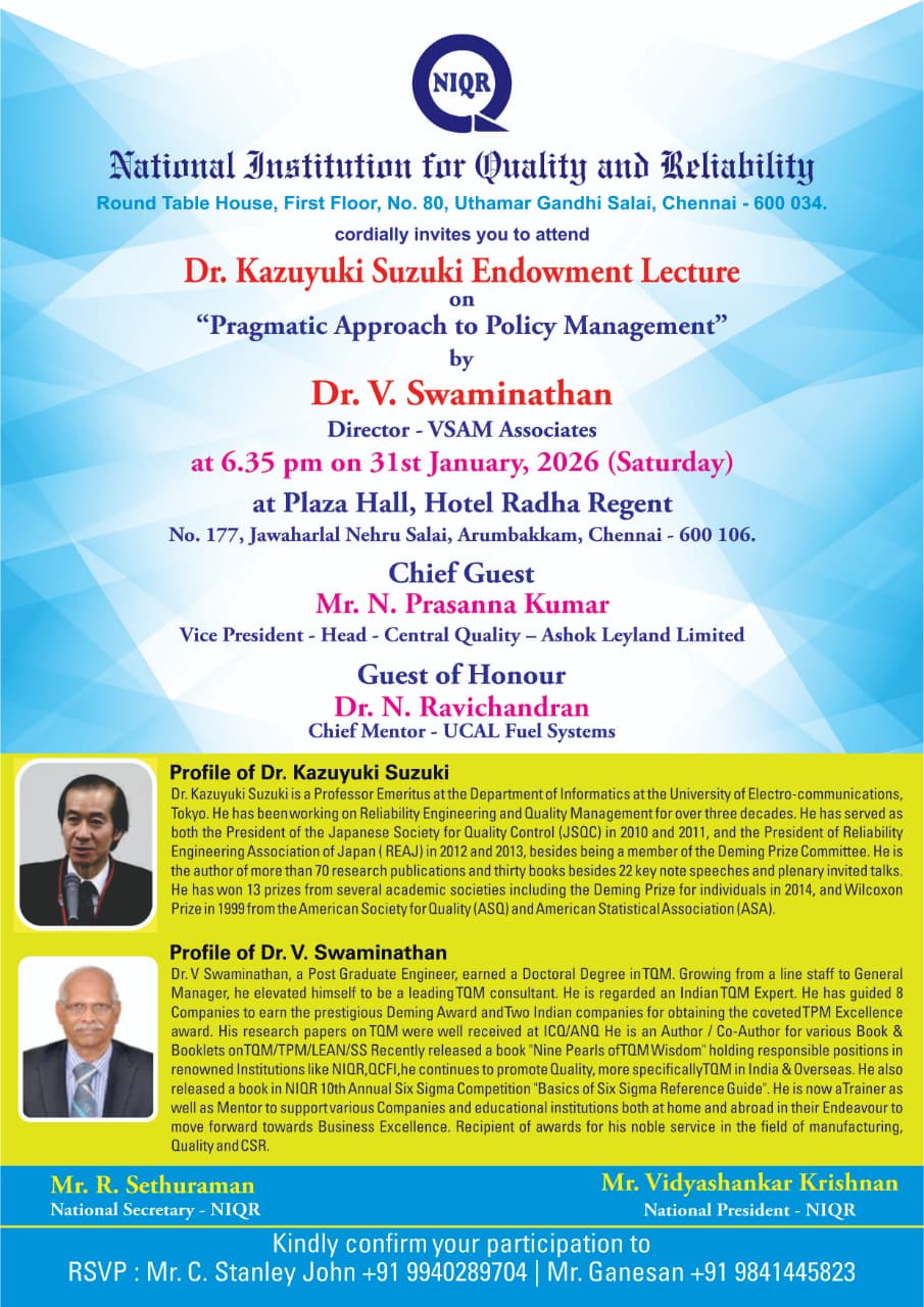 Organise Quality Congress, conferences, seminars, symposia, workshops, lectures and short duration training programs on quality and reliability. Evolve and organize comprehensive training programmes tailor made to suit the needs of different types of industries disciplines and levels.